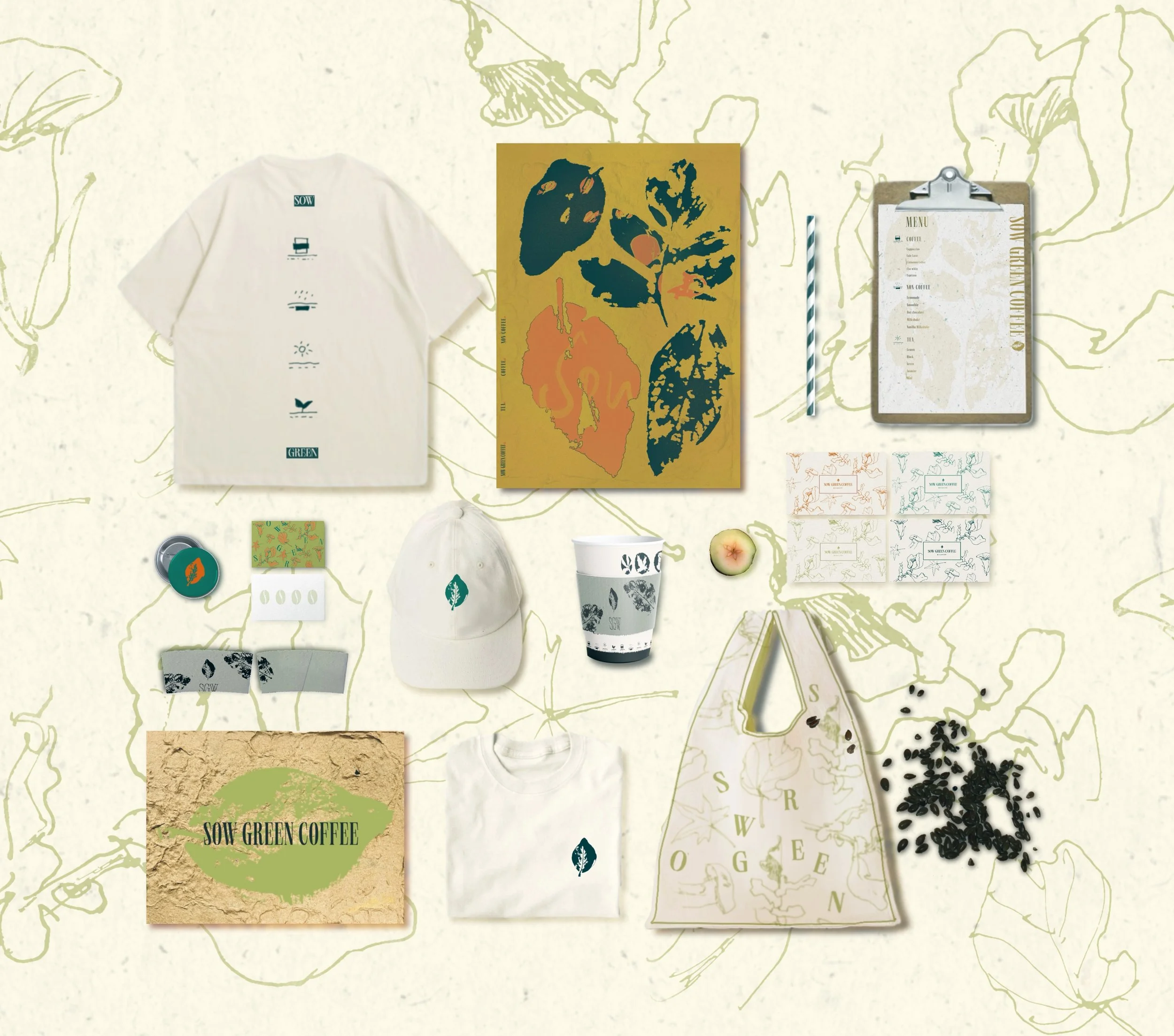 Visual identity design and infographic illustration for an environmentally friendly pop-up coffee car where the sleeves are made with compostable material and seeds, which can be sown into the ground and grow into plants.